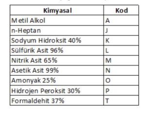 AJKLMNOPT kodları, aşağıdaki kimyasallara karşı en az 30 dakika dayanım gösterdiğini ifade eder: