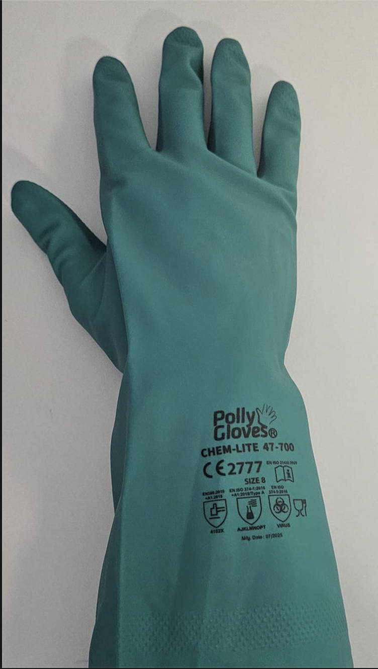 PollyGloves Chem-Lite 47-700, çeşitli kimyasallara karşı yüksek direnç sağlayan, endüstriyel kullanım amaçlı nitril eldivendir.